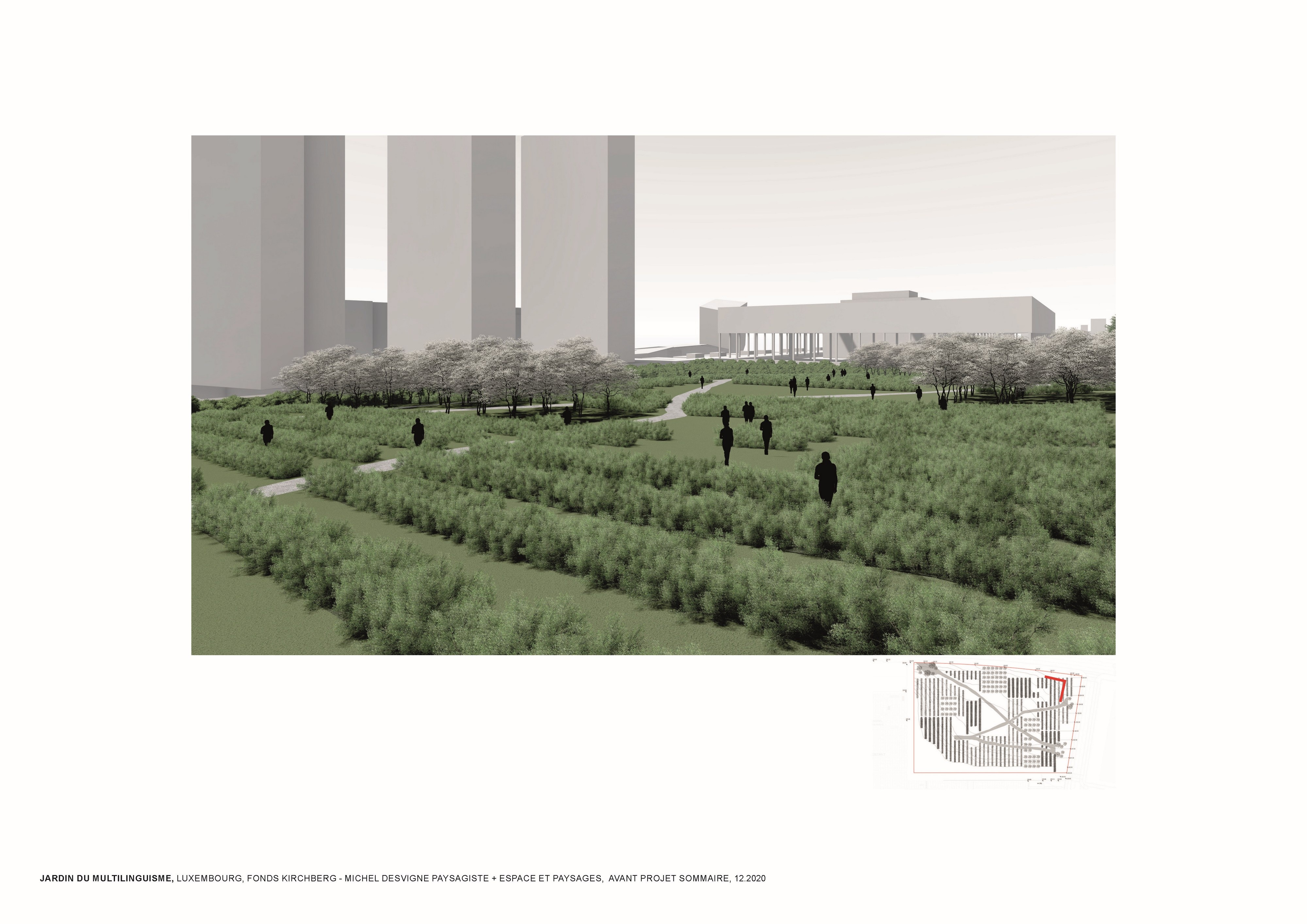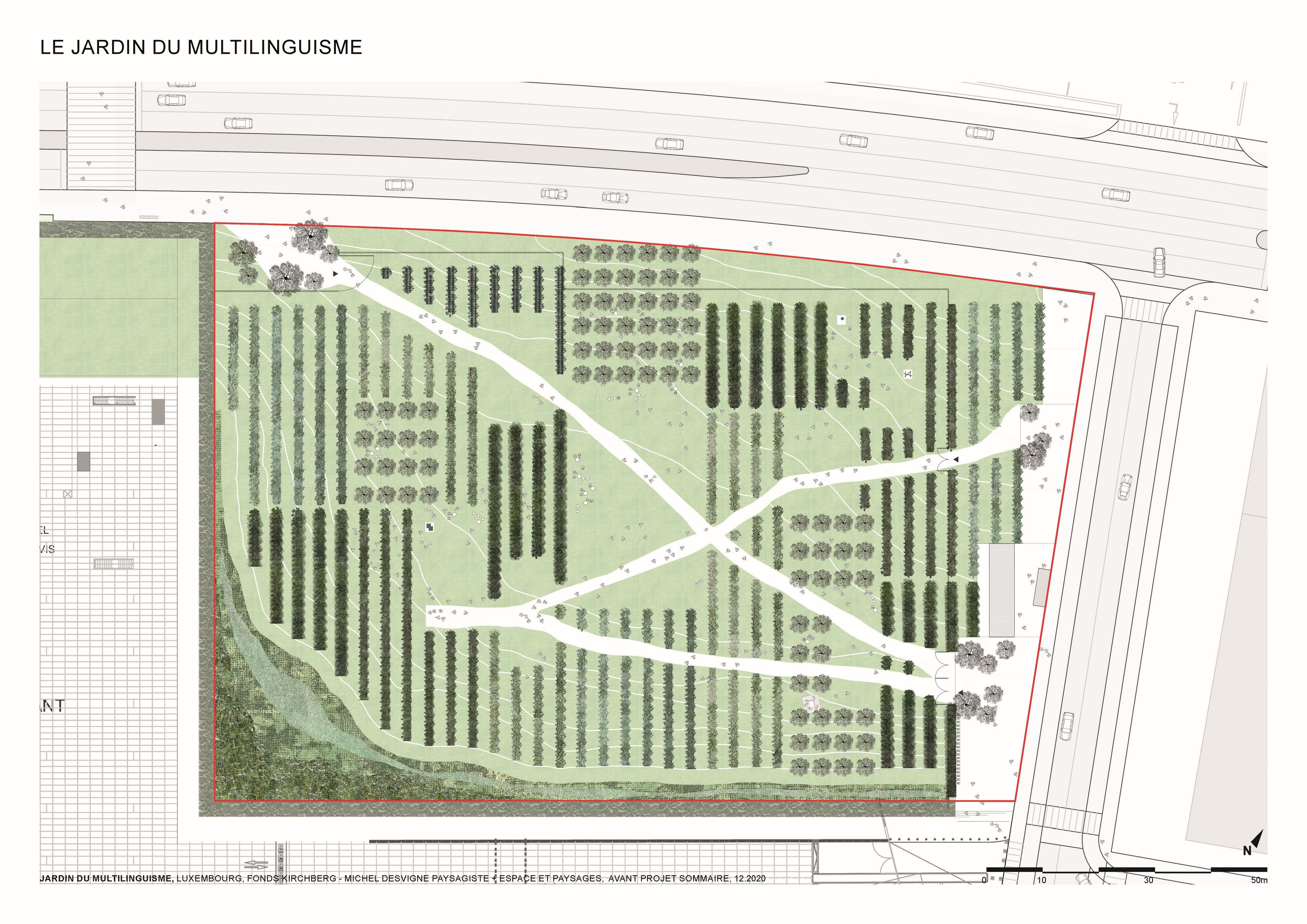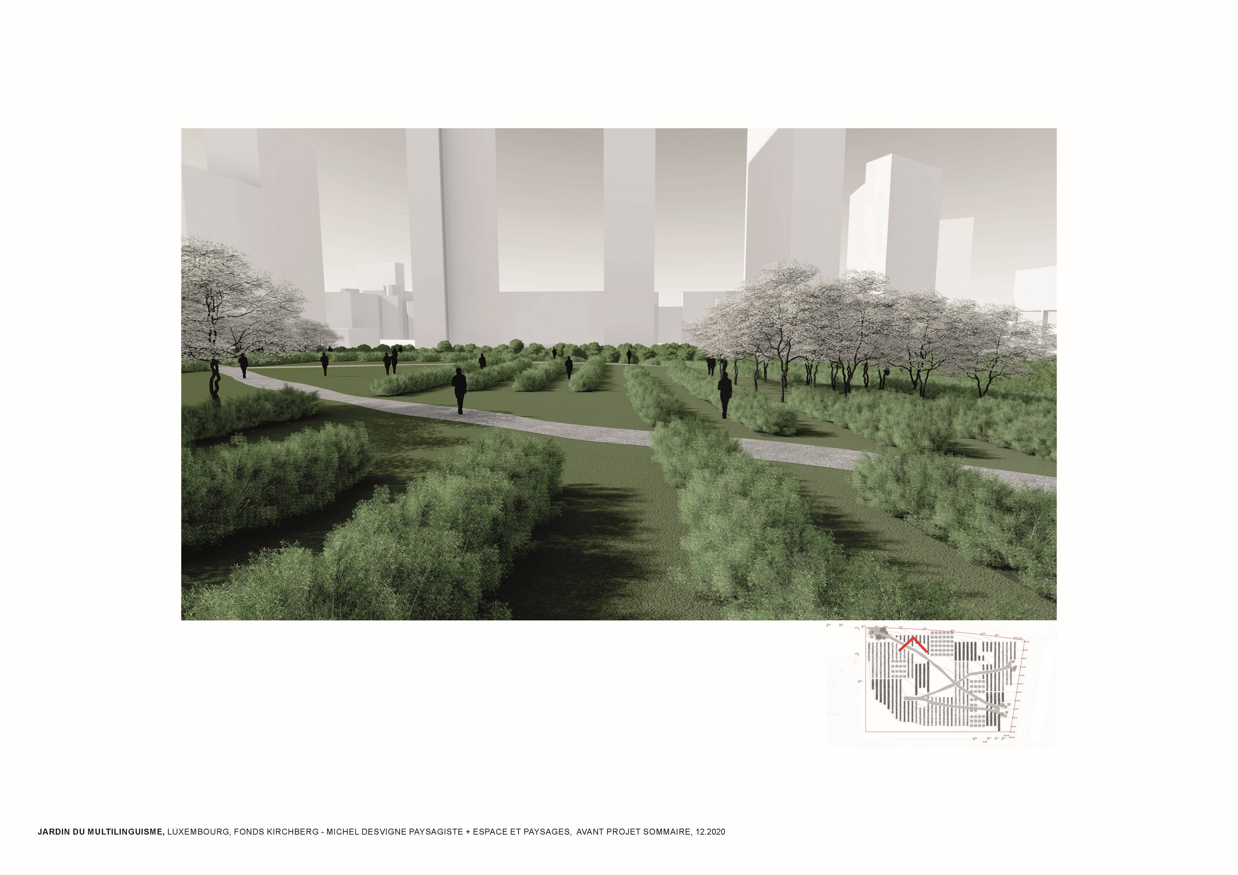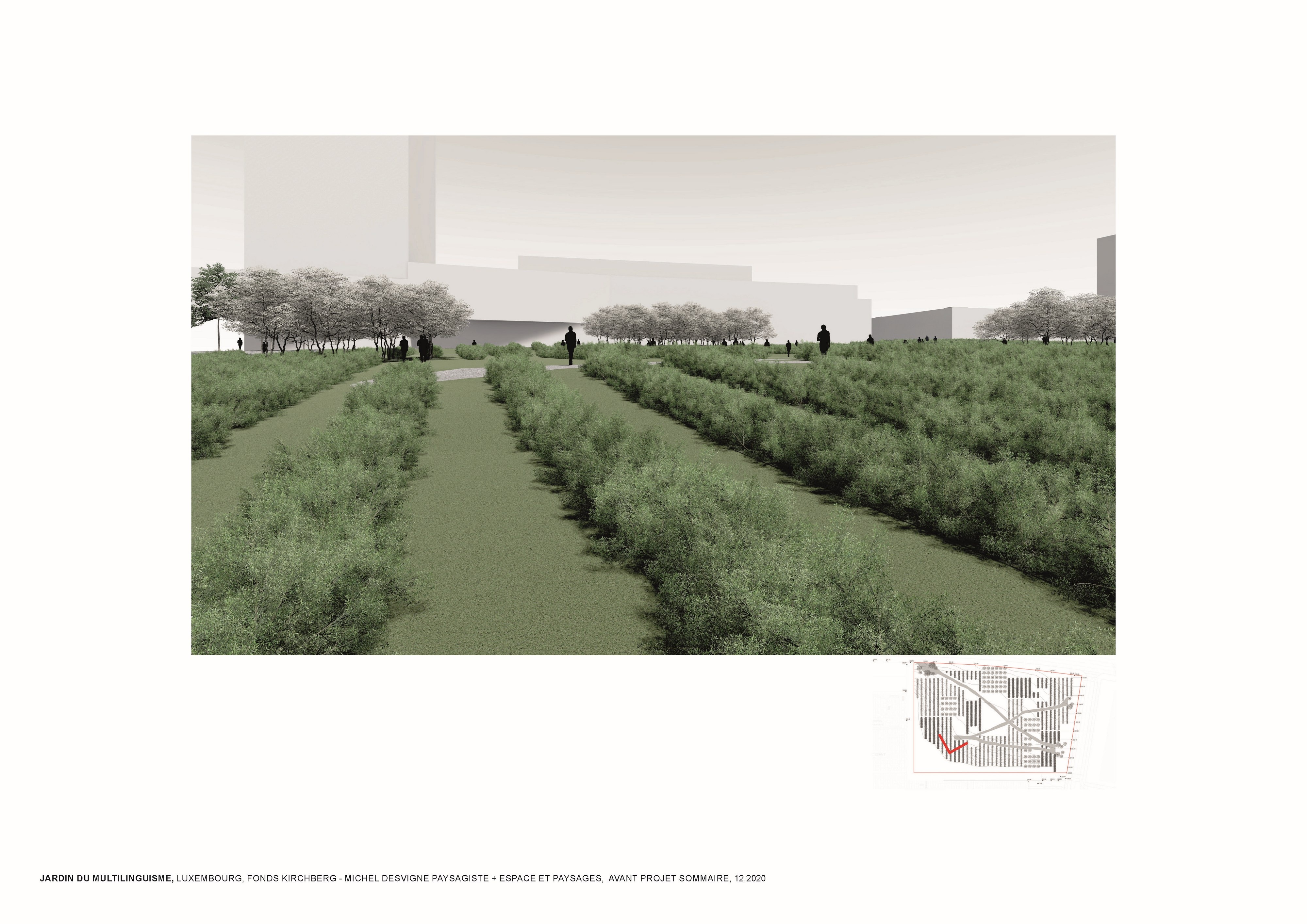 L’approche conceptuelle que l’architecte paysagiste Michel Desvigne a choisie est celle d’un paysage en miniature, inspiré des espaces agricoles. Leurs plantations tirent parti de la géographie locale, ils soulignent graphiquement les pentes. Des pièces végétales s’installent sur la topographie paysagère de ce jardin constitué d’une riche palette végétale. La vocation de ces chambres, en plus d’accueillir les usagers dans les moments de détente, est de répondre à la demande d’organiser des festivals de différentes natures. Dans les pièces on pourra, par exemple, retrouver des installations artistiques, permanentes ou éphémères, sur le thème du multilinguisme. Les chemins du jardin suivent la topographie du site en reliant les pièces végétales. Comme dans les paysages agricoles la liaison entre les parcelles se fait par un trait simple qui épouse les niveaux du terrain. Le chemin est constitué d’un revêtement minéral dans lequel sont inscrits des lettres.