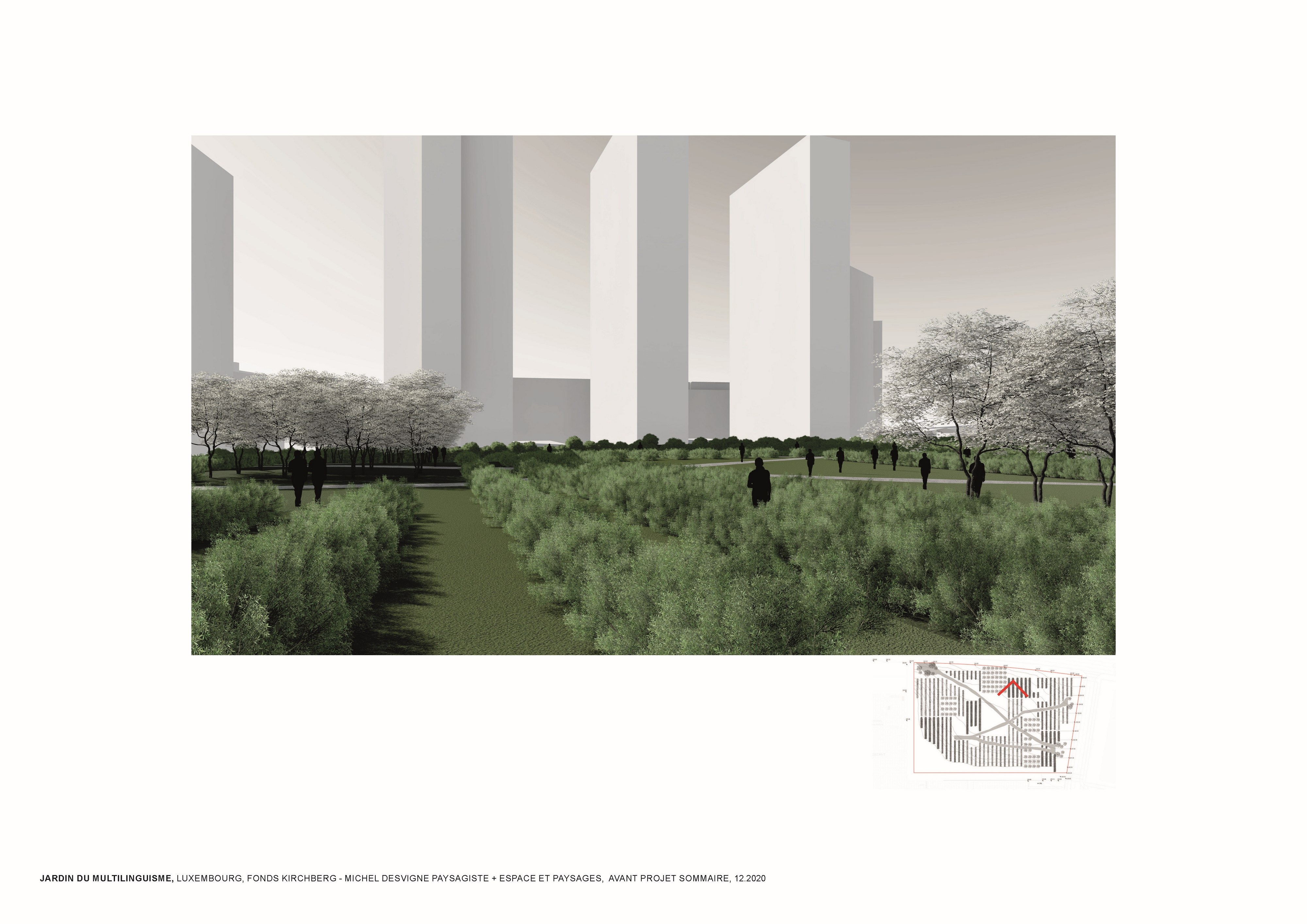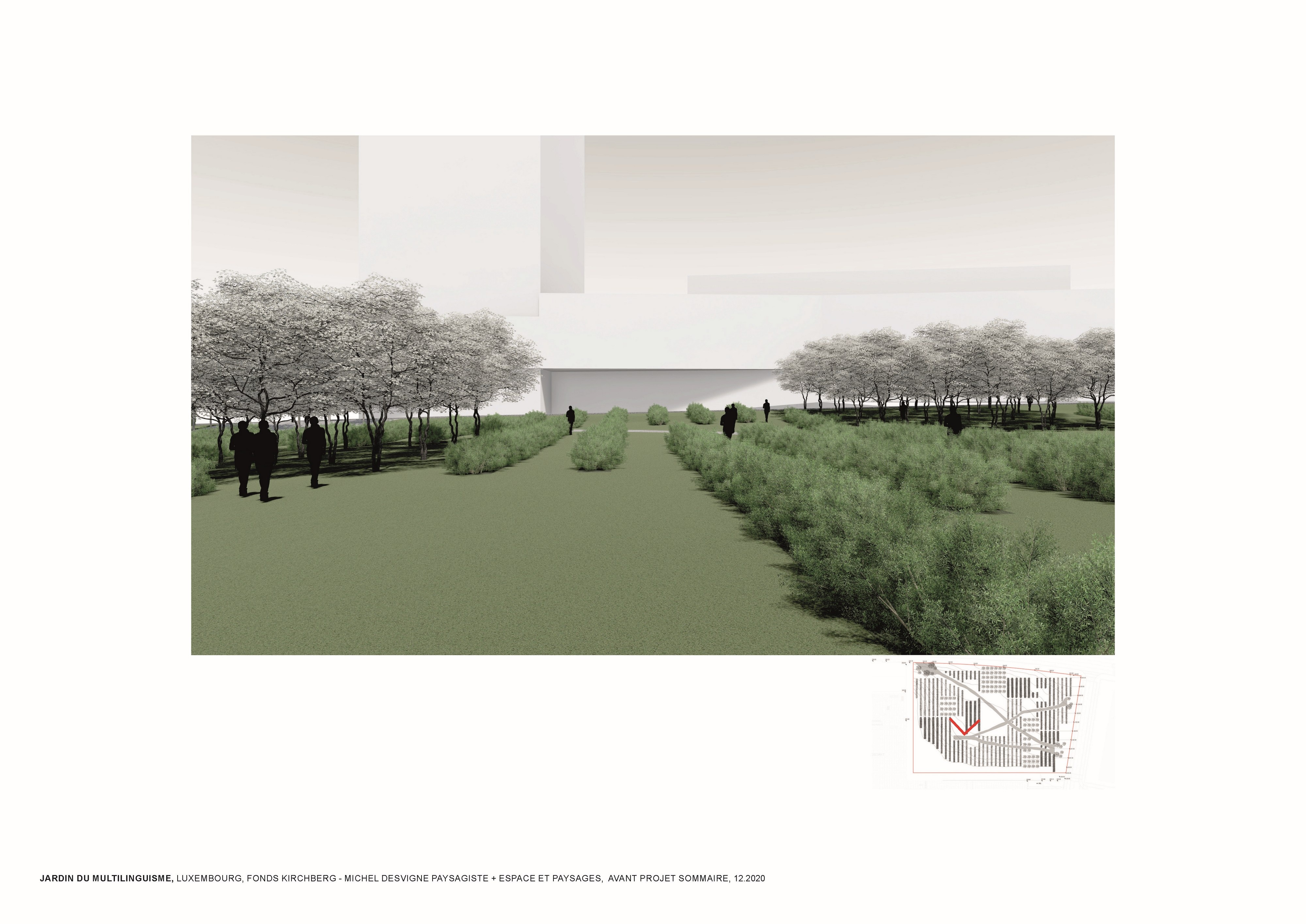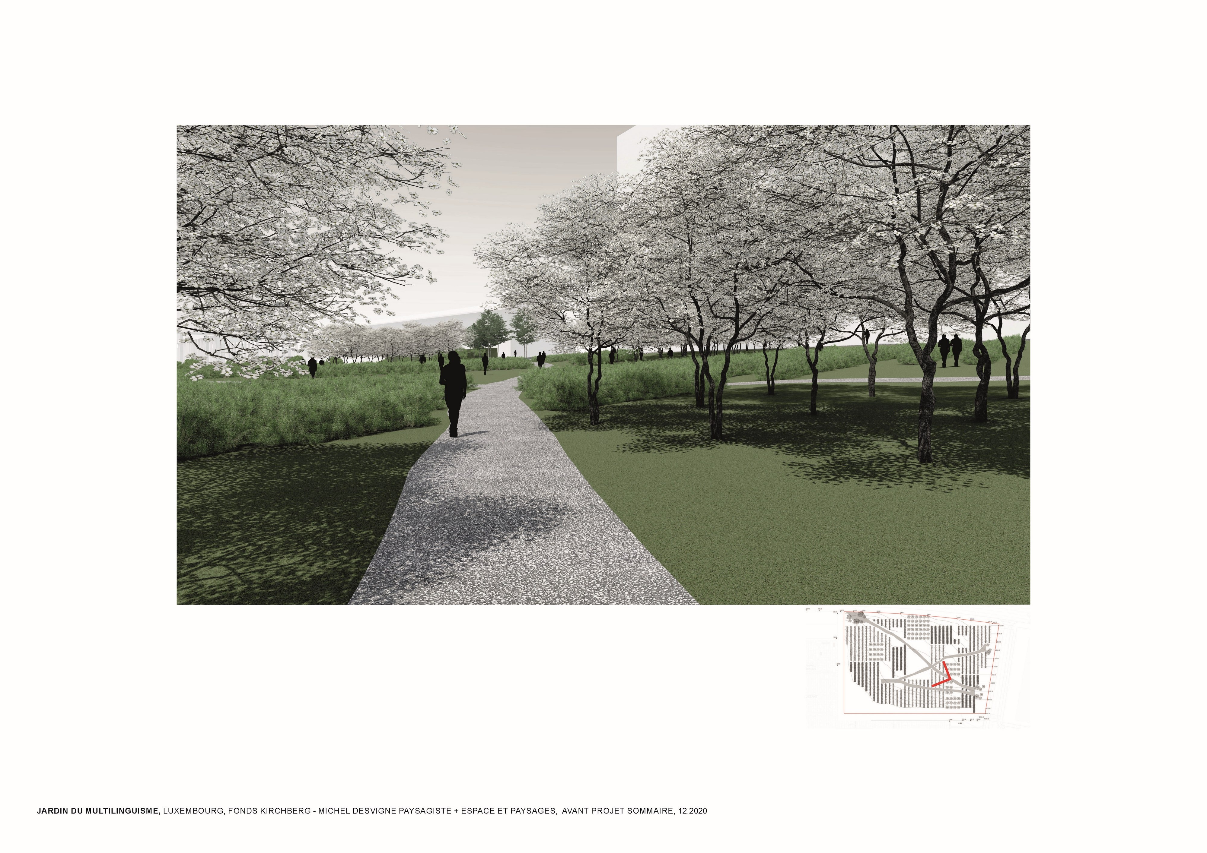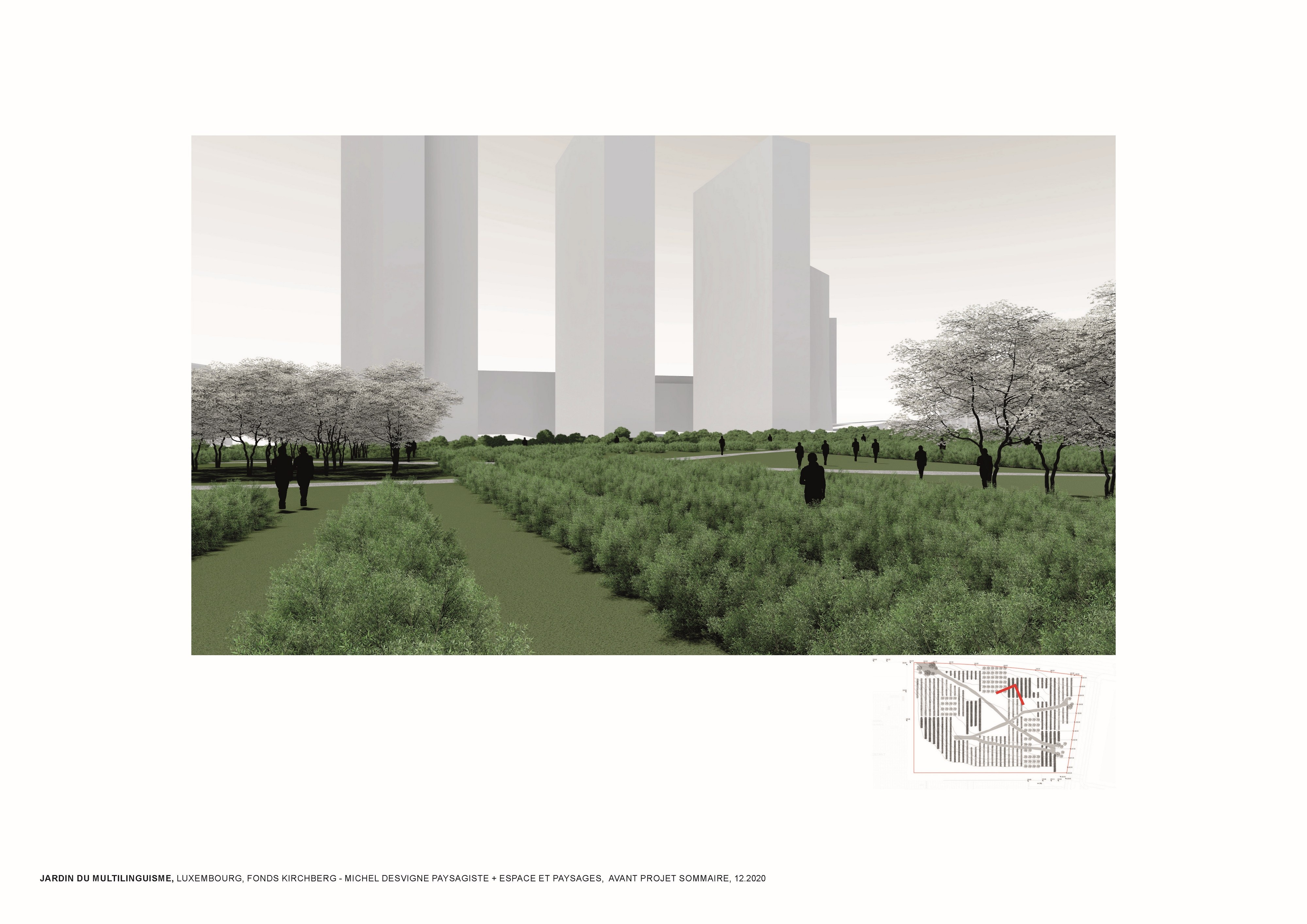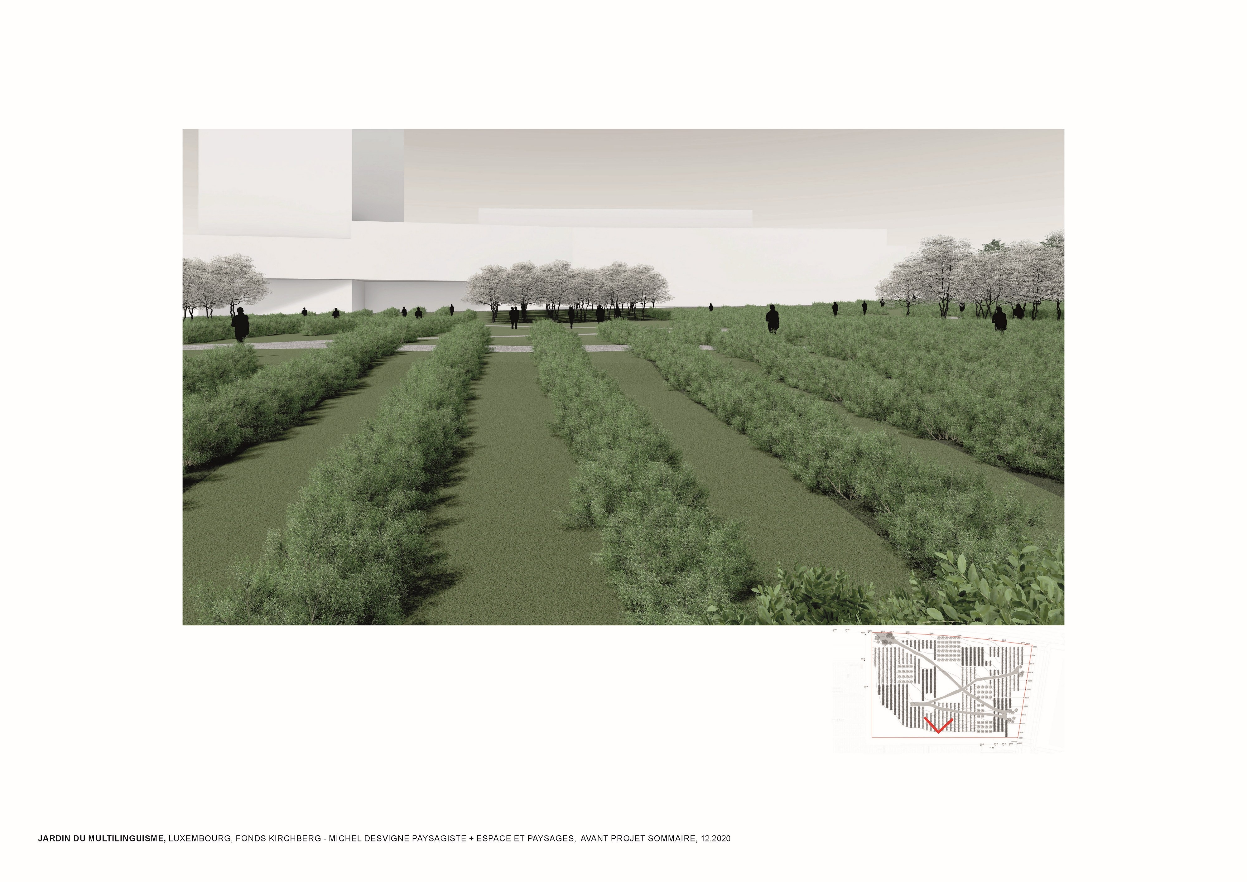 L’approche conceptuelle que l’architecte paysagiste Michel Desvigne a choisie est celle d’un paysage en miniature, inspiré des espaces agricoles. Leurs plantations tirent parti de la géographie locale, ils soulignent graphiquement les pentes. Des pièces végétales s’installent sur la topographie paysagère de ce jardin constitué d’une riche palette végétale. La vocation de ces chambres, en plus d’accueillir les usagers dans les moments de détente, est de répondre à la demande d’organiser des festivals de différentes natures. Dans les pièces on pourra, par exemple, retrouver des installations artistiques, permanentes ou éphémères, sur le thème du multilinguisme. Les chemins du jardin suivent la topographie du site en reliant les pièces végétales. Comme dans les paysages agricoles la liaison entre les parcelles se fait par un trait simple qui épouse les niveaux du terrain. Le chemin est constitué d’un revêtement minéral dans lequel sont inscrits des lettres.