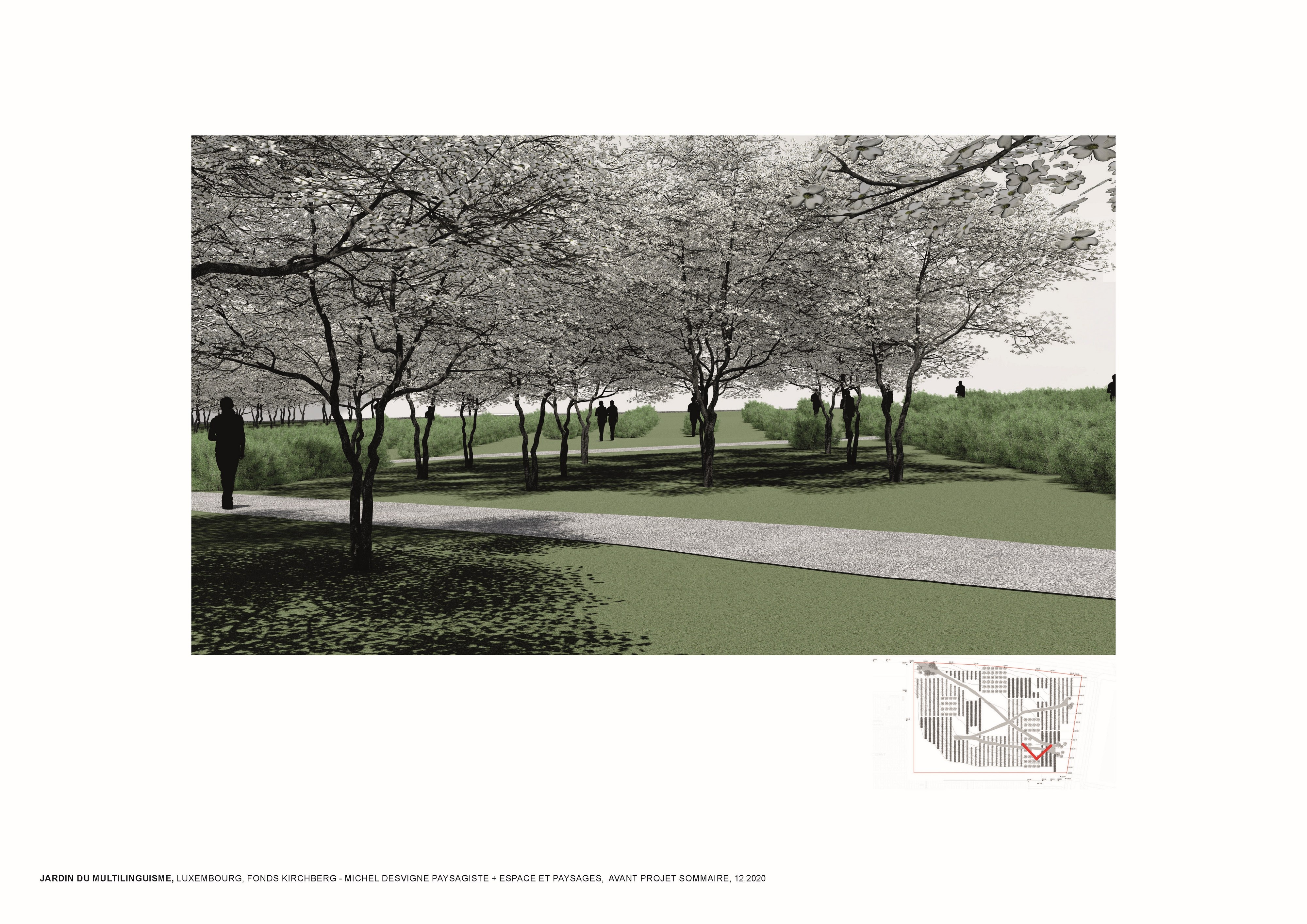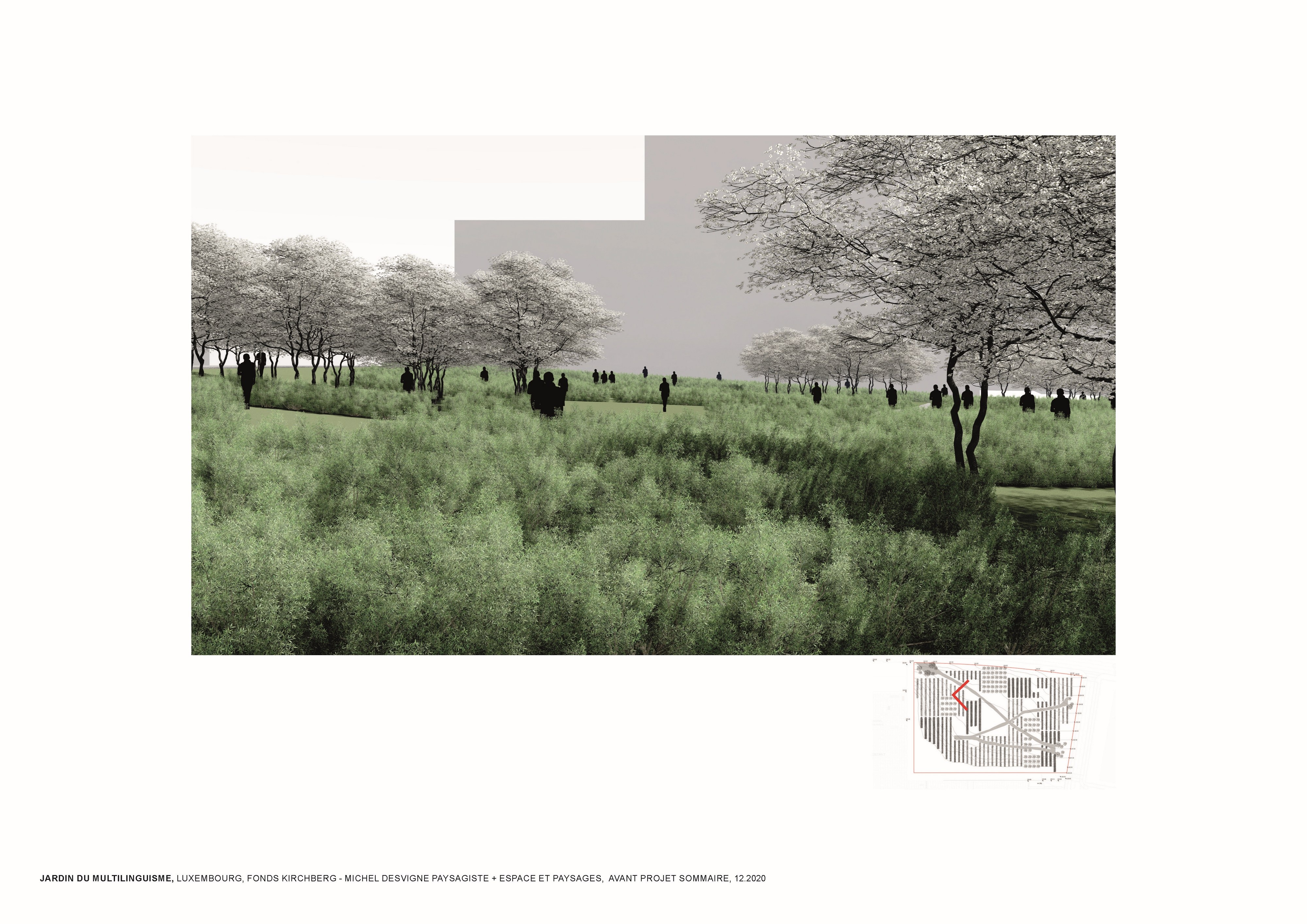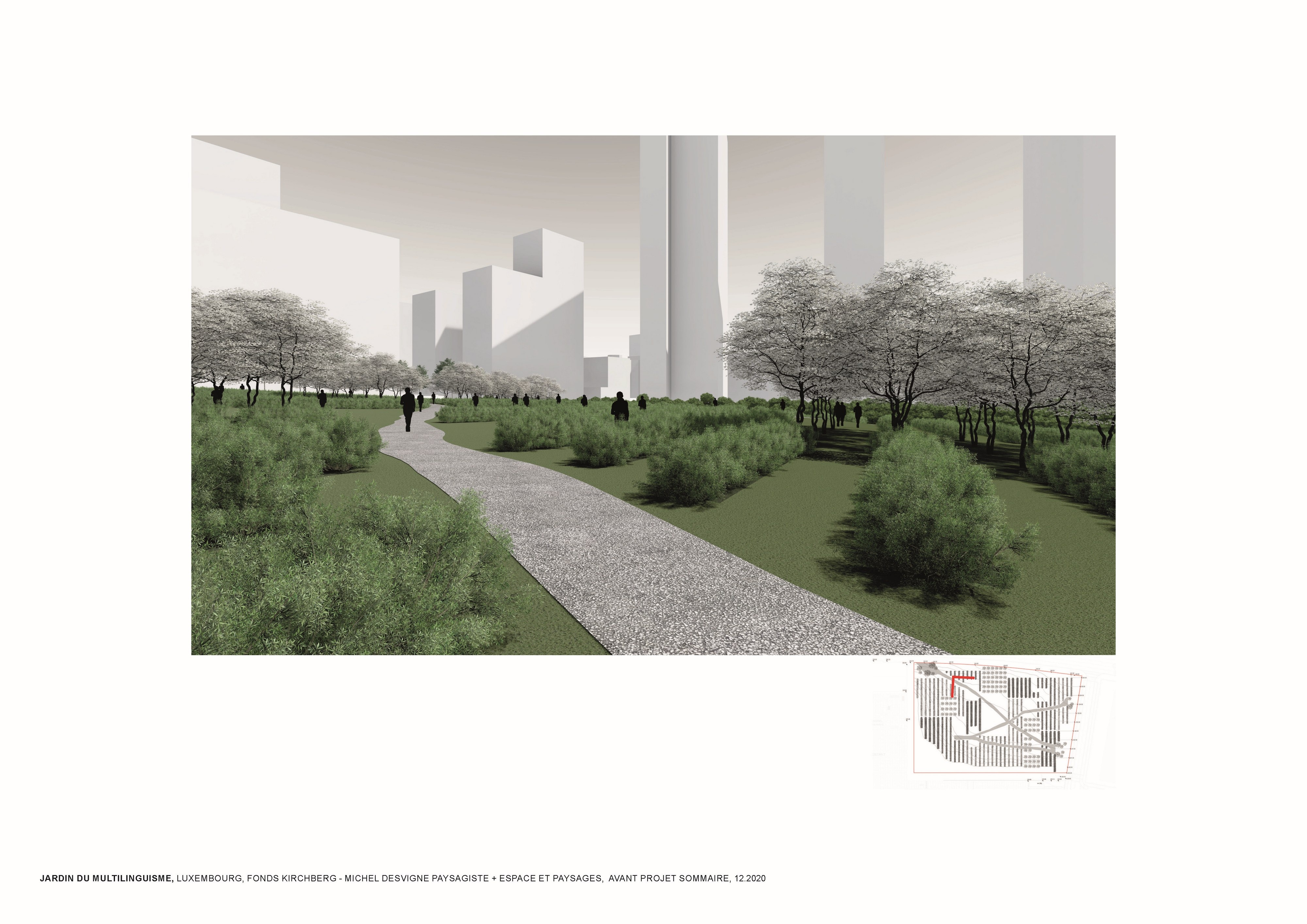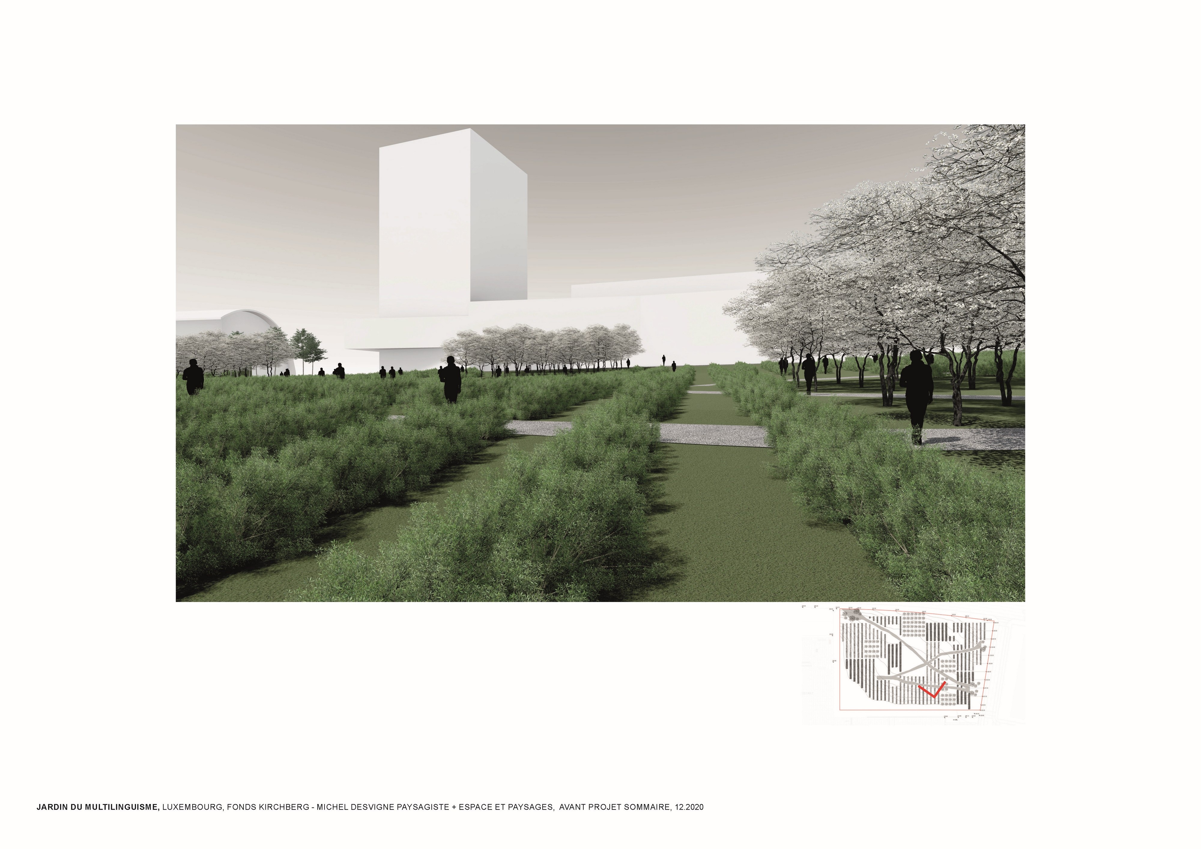 L’approche conceptuelle que l’architecte paysagiste Michel Desvigne a choisie est celle d’un paysage en miniature, inspiré des espaces agricoles. Leurs plantations tirent parti de la géographie locale, ils soulignent graphiquement les pentes. Des pièces végétales s’installent sur la topographie paysagère de ce jardin constitué d’une riche palette végétale. La vocation de ces chambres, en plus d’accueillir les usagers dans les moments de détente, est de répondre à la demande d’organiser des festivals de différentes natures. Dans les pièces on pourra, par exemple, retrouver des installations artistiques, permanentes ou éphémères, sur le thème du multilinguisme. Les chemins du jardin suivent la topographie du site en reliant les pièces végétales. Comme dans les paysages agricoles la liaison entre les parcelles se fait par un trait simple qui épouse les niveaux du terrain. Le chemin est constitué d’un revêtement minéral dans lequel sont inscrits des lettres.